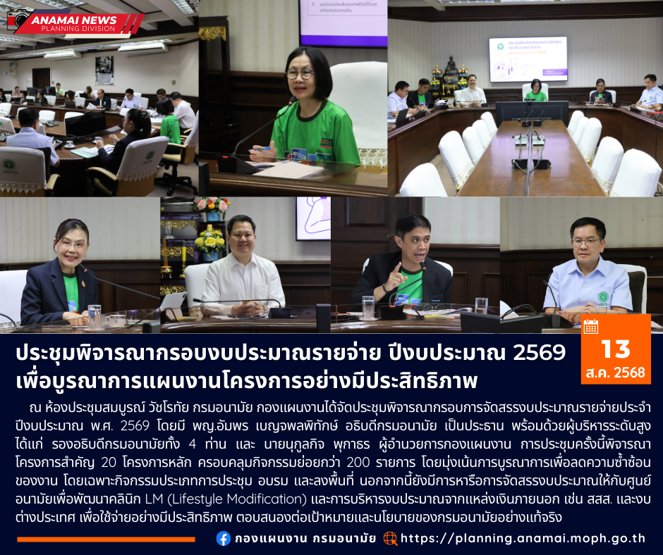 ?? วันที่ 13 สิงหาคม 2568 ณ ห้องประชุมสมบูรณ์ วัชโรทัย กรมอนามัย กองแผนงานได้จัดประชุมพิจารณากรอบการจัดสรรงบประมาณรายจ่ายประจำปีงบประมาณ พ.ศ. 2569 โดยมี แพทย์หญิงอัมพร เบญจพลพิทักษ์ อธิบดีกรมอนามัย เป็นประธาน พร้อมด้วยผู้บริหารระดับสูง กรมอนามัย ได้แก่ แพทย์หญิงนงนุช ภัทรอนันตนพ, นายแพทย์ปองพล วรปาณิ, นายแพทย์ธิติ แสวงธรรม และนายแพทย์ปกรณ์ ตุงคะเสรีรักษ์ รองอธิบดีกรมอนามัย และ นายนุกูลกิจ พุกาธร ผู้อำนวยการกองแผนงาน กรมอนามัย