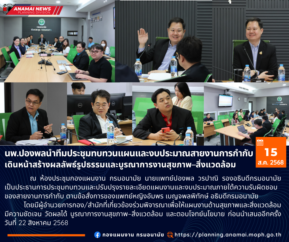 ?? วันที่ 15 สิงหาคม 2568 ณ ห้องกองแผนงาน กรมอนามัย นายแพทย์ปองพล วรปาณิ รองอธิบดีกรมอนามัย เป็นประธานการประชุมทบทวนและปรับปรุงรายละเอียดแผนงานและงบประมาณ ภายใต้ความรับผิดชอบของสายงานการกำกับ ตามข้อสั่งการของแพทย์หญิงอัมพร เบญจพลพิทักษ์ อธิบดีกรมอนามัย