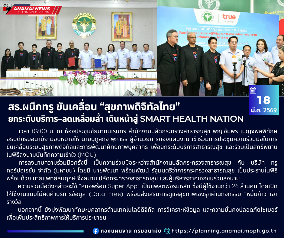 วันที่ 18 มีนาคม 2569 เวลา 09.00 น. ณ ห้องประชุมชัยนาทนเรนทร สำนักงานปลัดกระทรวงสาธารณสุข แพทย์หญิงอัมพร เบญจพลพิทักษ์ อธิบดีกรมอนามัย มอบหมายให้ นายนุกูลกิจ พุกาธร ผู้อำนวยการกองแผนงาน เข้าร่วมการประชุมความร่วมมือในการขับเคลื่อนระบบสุขภาพดิจิทัลและการพัฒนาศักยภาพบุคลากร เพื่อยกระดับบริการสาธารณสุข และร่วมเป็นสักขีพยานในพิธีลงนามบันทึกความเข้าใจ (MOU)