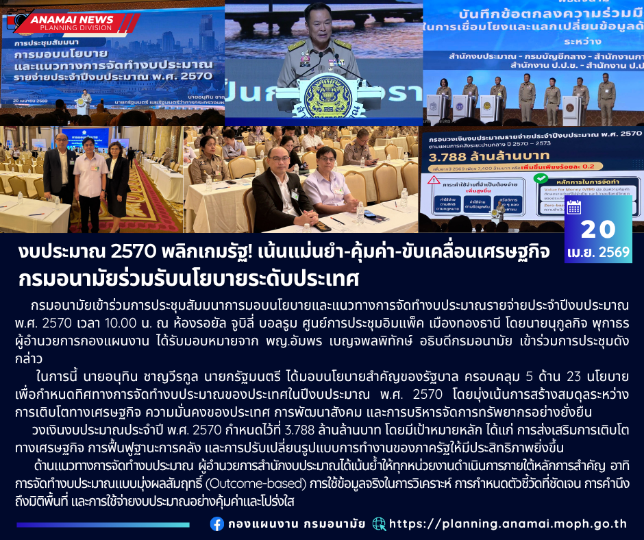 งบประมาณ 2570 พลิกเกมรัฐ! เน้นแม่นยำ-คุ้มค่า-ขับเคลื่อนเศรษฐกิจ กรมอนามัยร่วมรับนโยบายระดับประเทศ”